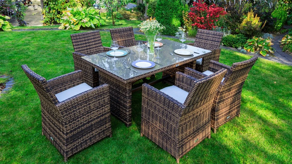 большой обеденный стол со столешницей из закаленного стекла. Съемные чехлы для подушек серого цвета изготовлены из водоотталкивающей ткани, которая не подвержена изменению от погодных условий. Сдержанный современный дизайн и использование нейтральных коричневых оттенков - преимущества комплекта. Этот набор садовой мебели будет гармонично смотреться в любом окружении. Он подходит для установки на террасе или веранде, в летней беседке или под открытым небом на Вашем участке.