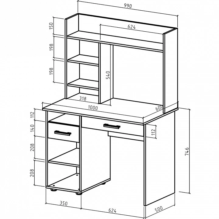 надстройка:, 1 дверца, 2 полки; тумбочка:, 1 дверца, 1 ящик, 2 полки; 1 ящик