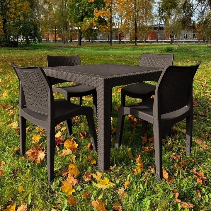 Стильный и практичный комплект мебели JULY MINI S из высокопрочного пластика в коричневом цвете — идеально подчеркнет Ваш уют и добавит современного шика вашему пространству! Этот набор включает просторный стол размером 95х95х75 см и четыре комфортабельных стула 49х52х84 см, созданных из высокопрочного пластика, отличающегося высокой износостойкостью и легкостью в уходе. Благодаря своему современному дизайну и элегантному цвету, комплект идеально впишется в любую обстановку — от уютной террасы до стильной Cafe-зоны. Этот комплект мебели — превосходный выбор для тех, кто ценит качество, стиль и комфорт!
