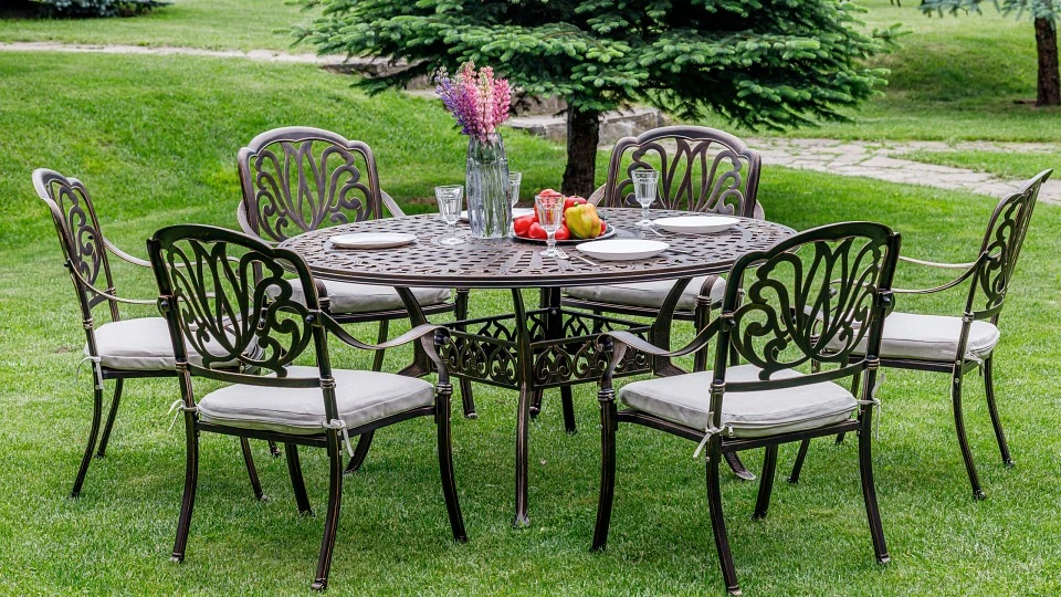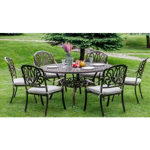 Комплект садовой мебели WILHELM создан специально для уютного отдыха на вашем участке. Включает в себя шесть элегантных кресла и круглый стол. Он рассчитан на шесть персон. Каркас кресел и стола выполнен в бронзовом цвете, что придает им изысканный вид, а подушки выполнены в нейтральной бежевой гамме, что добавляет мягкости и комфорта. Кресла изготовлены из прочного литого алюминия, который обеспечивает надежность и долговечность конструкции. Этот материал не подвержен коррозии и легко чистится, что делает уход за мебелью максимально простым. Эргономичный дизайн кресел обеспечивает комфортное сидение, а стильное исполнение придаст вашему саду или террасе особый шарм. Круглый стол с элегантным дизайном и прочной столешницей идеально дополнит общий вид комплекта. С этим комплектом садовой мебели вы сможете наслаждаться отдыхом на свежем воздухе в уютной обстановке. Он идеально подойдет для семейных посиделок, вечерних чаепитий или приема гостей. Создайте свой уголок комфорта с комплектом садовой мебели WILHELM