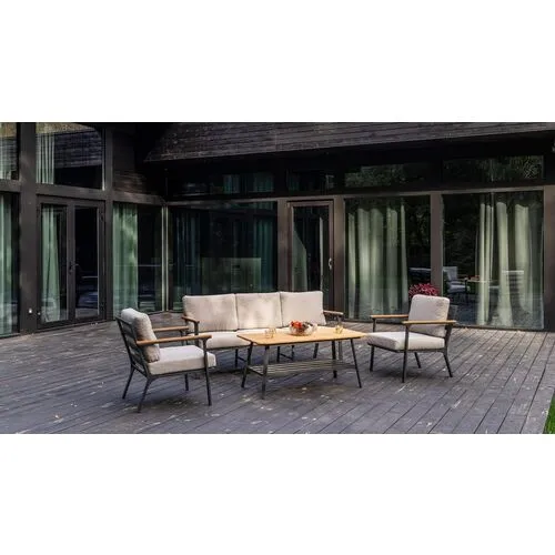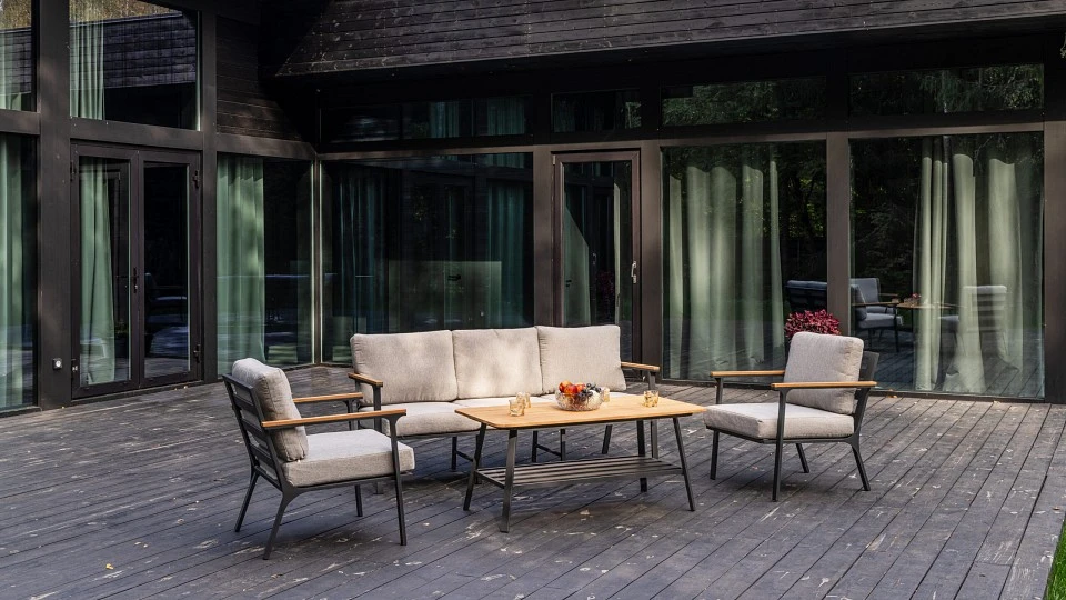 журнальный столик со столешницей из тика. Алюминиевый каркас антрацитового цвета делает мебель легкой и прочной одновременно, что позволяет использовать ее как на открытом воздухе, так и в помещении. Мебель выдерживает любые погодные условия, не выцветает на солнце и не ржавеет под дождем. Диван и кресла дополнены мягкими подушками светло-серого цвета, которые обеспечивают удобство и комфорт во время отдыха. Подушки выполнены из высококачественного материала OLEFIN, который не только приятен на ощупь, но и легко чистится. Кресла с подлокотниками из тика добавляют естественности и тепла в дизайн мебели. Тик является долговечным материалом, который выдерживает воздействие влаги и солнечных лучей. Журнальный столик со столешницей из тика имеет простой и современный дизайн, который позволяет легко сочетаться с любым интерьером. Столик может использоваться как для хранения напитков и закусок, так и для размещения книг и журналов. Лаунж-зона OLIVER рассчитана на 5 персон и идеально подходит для проведения вечеринок
