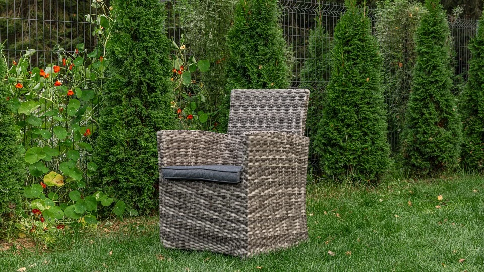 Обеденное кресло FIONA из искусственного ротанга серого цвета Обеденное кресло FIONA - станет идеальным решением в зоне отдыха, на садовом участке, в офисе или кафе! Благодаря современному дизайну и сдержанным серым оттенкам кресло прекрасно впишется в любой интерьер. Каркас из высокопрочной стали способен выдерживать высокие весовые и другие механические нагрузки без риска деформации и расшатывания. Стальной каркас окрашен порошковым методом, что защищает его от коррозии, поэтому кресло будет радовать вас долгие годы. В качестве декоративной отделки использовано плотное плетение искусственного ротанга серого цвета, не подверженного гниению при контактах с водой и сохраняющего цвет при постоянном воздействии солнечных лучей. Кресло дополнено дополнен мягкими подушками-сиденьями с чехлами из водонепроницаемой ткани Olefin, что обеспечивает еще больший комфорт и удовольствие Кресло имеет одно посадочное место, максимально допустимая нагрузка на которое 150 кг Сочетается с комплектами FIONA, GENRY, GRAND VICKY,